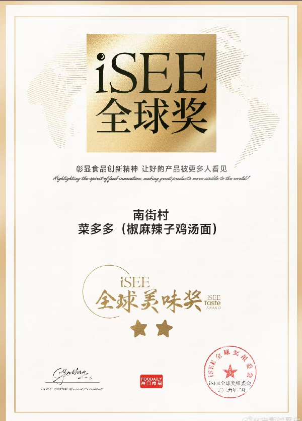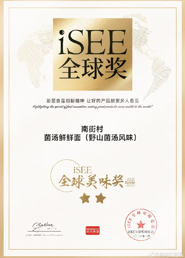 大河网讯 近日,第八届iSEE全球奖评审结果正式公布,河南省南街村(集团)有限公司菜多多、菌汤鲜鲜面产品,凭借卓越的品质与风味,荣获iSEE全球美味奖2星殊荣。此次获奖的背后,离不开漯河市场监督管理局南街分局的精准指导与全程助力,标志着南街村集团在品牌国际化与品质标准化建设中迈出关键一步 。