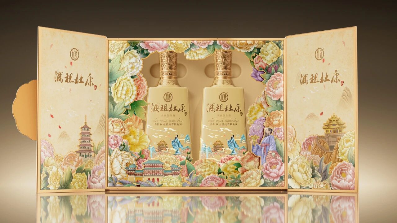 牡丹和杜康,作为根植于河洛大地的文化宝藏,一直是洛阳的城市名片。每逢四月,中国洛阳牡丹文化节盛大开幕,必有酒祖杜康作为指定用酒,宴饮四海宾朋。酒祖杜康∙第43届中国洛阳牡丹文化节纪念酒,延续酒祖杜康编钟造型的经典视觉符号,以“唯有牡丹真国色,花开时节醉杜康”为核心插画创意,深耕洛阳隋唐时期牡丹与杜康共生的盛世文化底蕴。